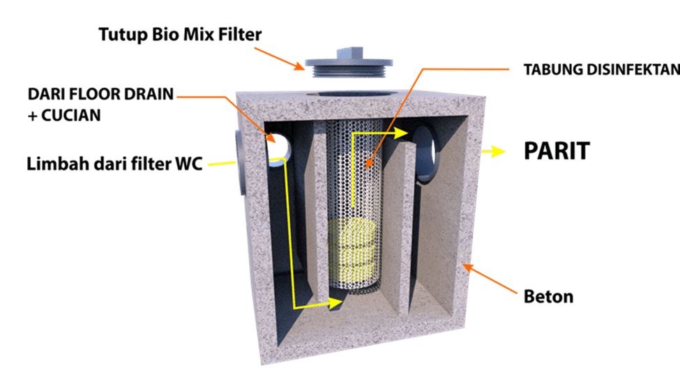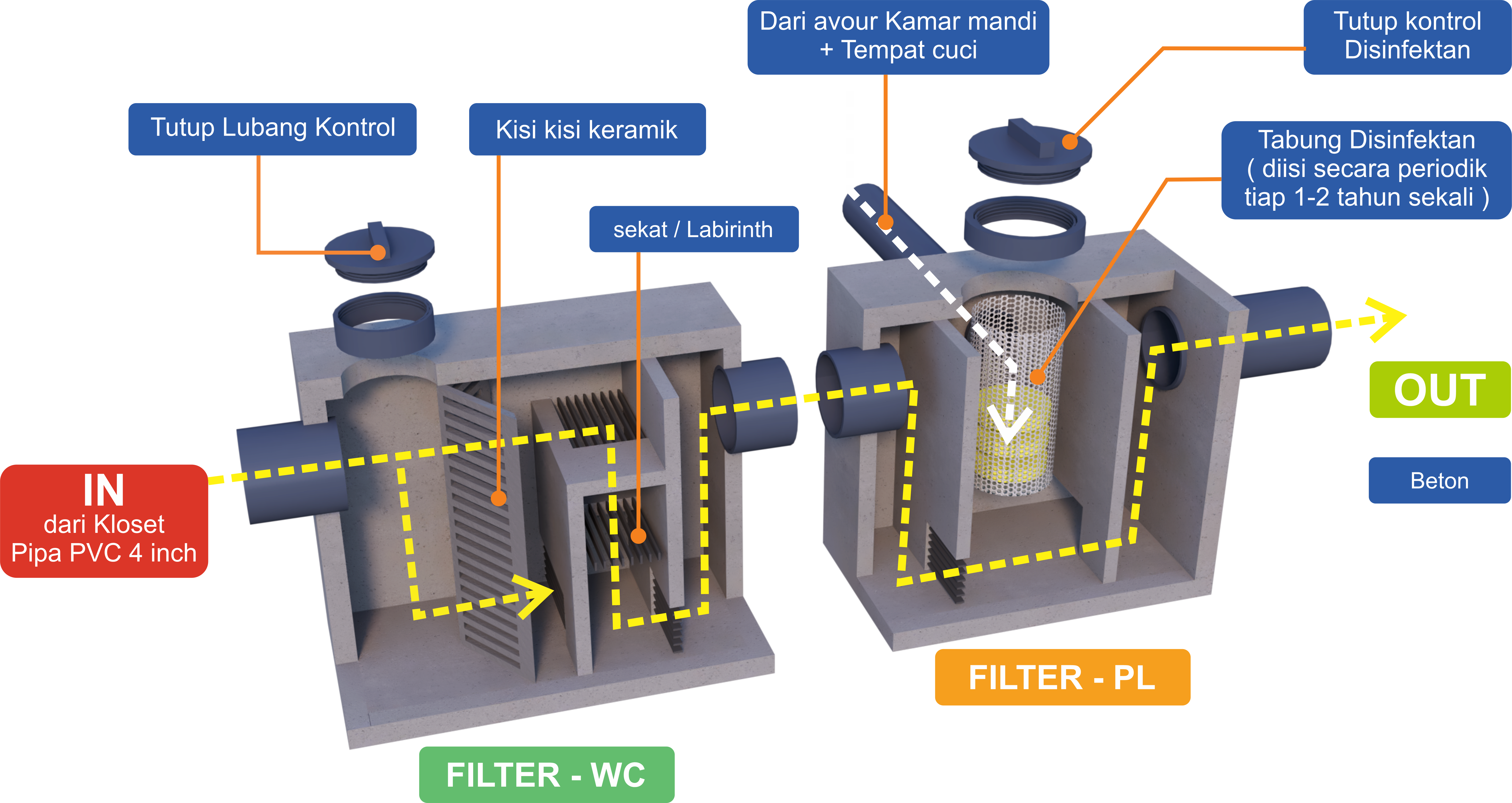 Kotoran atau tinja dari kloset akan masuk ke dalam filter WC. Di dalam filter WC ini kotoran akan dihancurkan dengan bantuan tekanan air, udara, dan gravitasi. Filter WC juga mempunyai fungsi menyaring semua benda yang masuk, maka dibuatlah tutup control yang akan memudahkan pembersihan dan maintenance jika terjadi penyumbatan akibat kemasukan benda2 anorganik yang tidak bisa dihancurkan dan diurai oleh Filter seperti bahan dari plastik & kain (bungkus sampo, pembalut dll), maintenance hanya diperlukan saat tersumbat saja, dan hal ini sangat jarang terjadi asalkan tidak membuang benda2 anorganik ke dalam kloset.